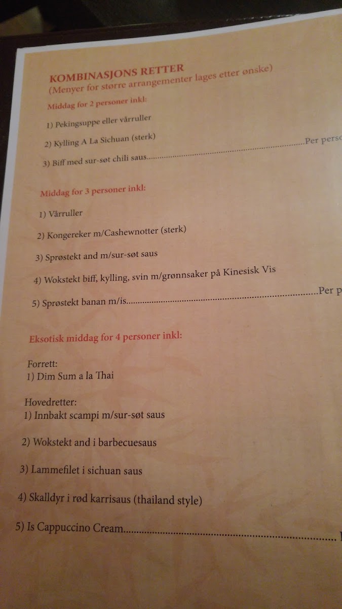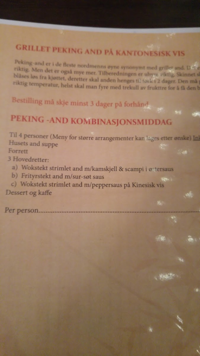 The menu at Ming Wah Kinarestaurant in Askim reflects a well-balanced approach to classic Asian-inspired comfort food, focusing on familiar flavors that appeal to a wide range of diners. Simple options like Kaffe provide a straightforward finish to the meal, while lighter cold dishes such as Rekesalat add freshness and contrast to the richer items on the menu. For those with a sweet tooth, desserts like Frityrstekt Banan and Fritert Banan Og Is stand out as reliable favorites, combining warm, crispy textures with gentle sweetness that feels indulgent without being overwhelming. On the savory side, Stekte Nudler represents a staple choice, offering satisfying portions and well-seasoned noodles that work as either a main dish or a shared plate. The highlight among the more elaborate dishes is Crispy Strimlet Okseytrefilet Med Grønnsaker I Sur-søt Saus, which brings together tender beef, crisp vegetables, and a balanced sweet-and-sour sauce, showcasing the kitchen’s ability to deliver bold flavors while maintaining harmony on the plate. Overall, the menu feels cohesive and approachable, with each highlighted dish contributing to a dining experience that emphasizes consistency, comfort, and familiar tastes rather than unnecessary complexity.
